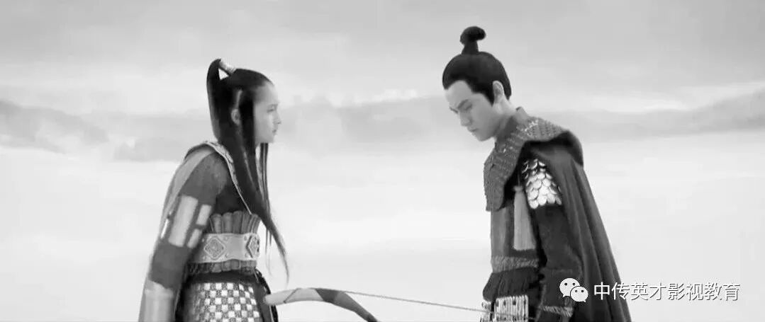 镜头14是一个背向镜头,霍心仍旧注视着画外,保持他陷入回忆前的姿势,只是摄像机拍摄方向变化了。镜头15给了靖公主正面镜头和霍心的半张脸,与之前镜头5的姿势呼应,为了避免镜头重复,镜头15中摄像机拍摄方向变化了,这样构图的目的是要把之前中断了的叙事捡起再续。镜头16霍心转身侧向迎着观众,叙事进程跳出了闪回剧情,回到现实的叙事场景中来。
